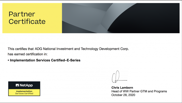 Chỉ sau 6 tháng từ khi chính thức hợp tác cùng NETAPP, trở thành Nhà phân phối sản phẩm NetApp để đưa các sản phẩm ưu việt của thương hiệu này như đám mây lai NetApp đến gần hơn với các doanh nghiệp Việt; đến nay, ADG đã chính thức nhận được chứng nhận “Đối tác triển khai Hỗ trợ dịch vụ Netapp“, hỗ trợ dịch vụ NetApp chính hãng tại Việt Nam.